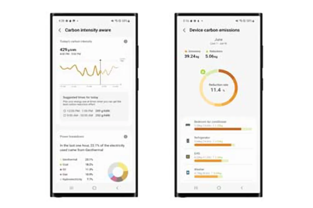 Samsung’s SmartThings Energy uses AI technology and Demand Response programs to empower you to take control of your carbon footprint and lower your monthly energy bill. AI Energy Mode monitors the energy usage of your connected appliances and automatically optimizes their operation to reduce your home’s consumption. It will also automatically adjust devices enrolled in Demand Response programs, so you earn cash rewards and savings during periods of high energy consumption. Plus, a new Carbon Intensity Awareness feature calculates the carbon footprint of your energy usage to offer insight into the energy production and carbon intensity of where you live.